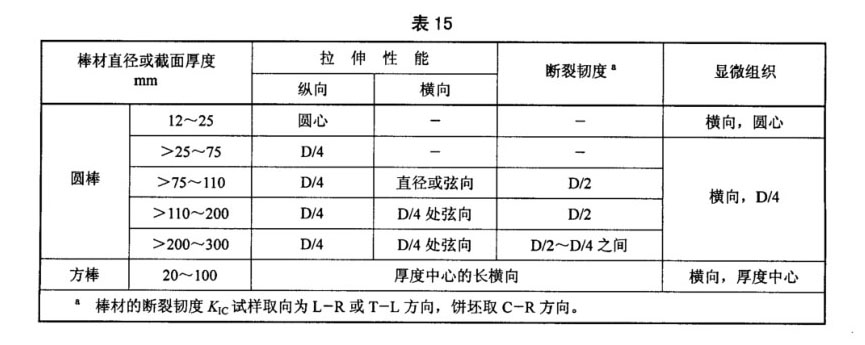毛坯加熱到β相變溫度以下20℃~40℃, 保溫30min, 在鍛錘或壓力機上一火鐓粗至高度為24mm±3mm的餅坯,然后按3.3.1條推薦的制度進行熱處理。敏粗餅坯一半由承制方進行試驗,另一半與該批棒材一起提交訂購方。餅坯按表14規定的取樣數量進行室溫力學性能和斷裂韌度試驗,取樣位置為餅坯厚度中心處的D/2~D/4之間的弦向。