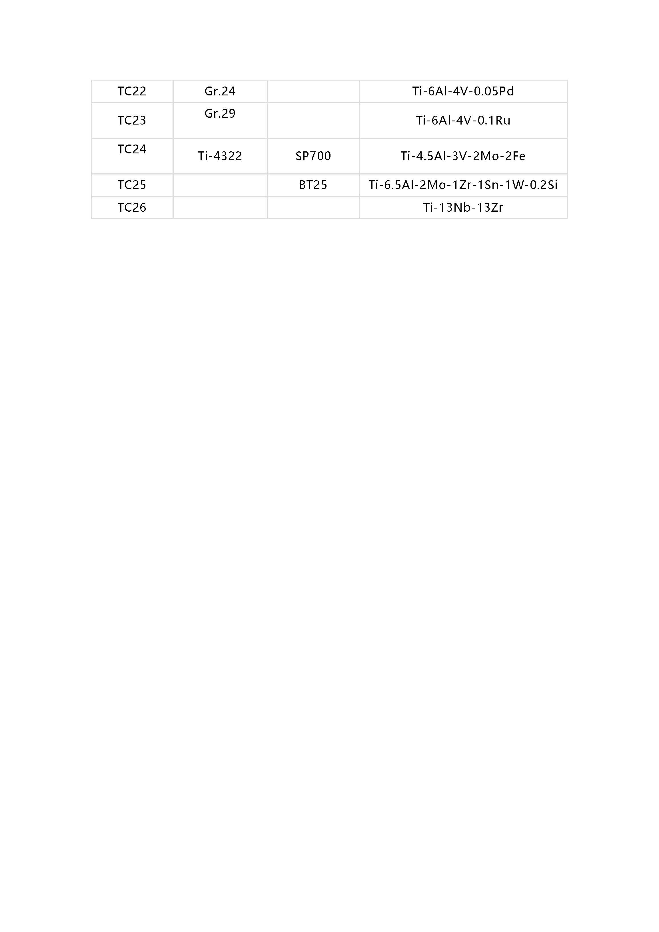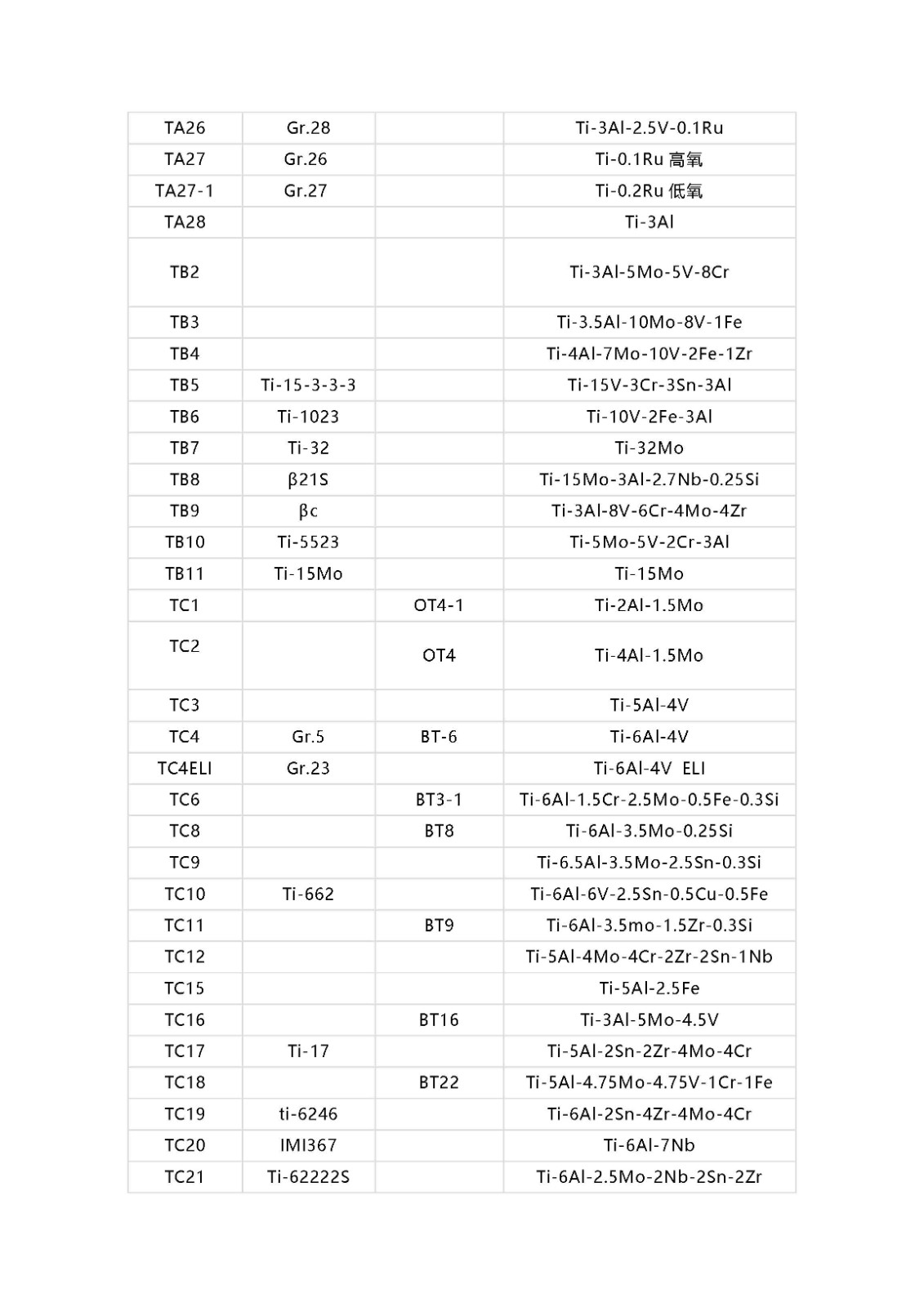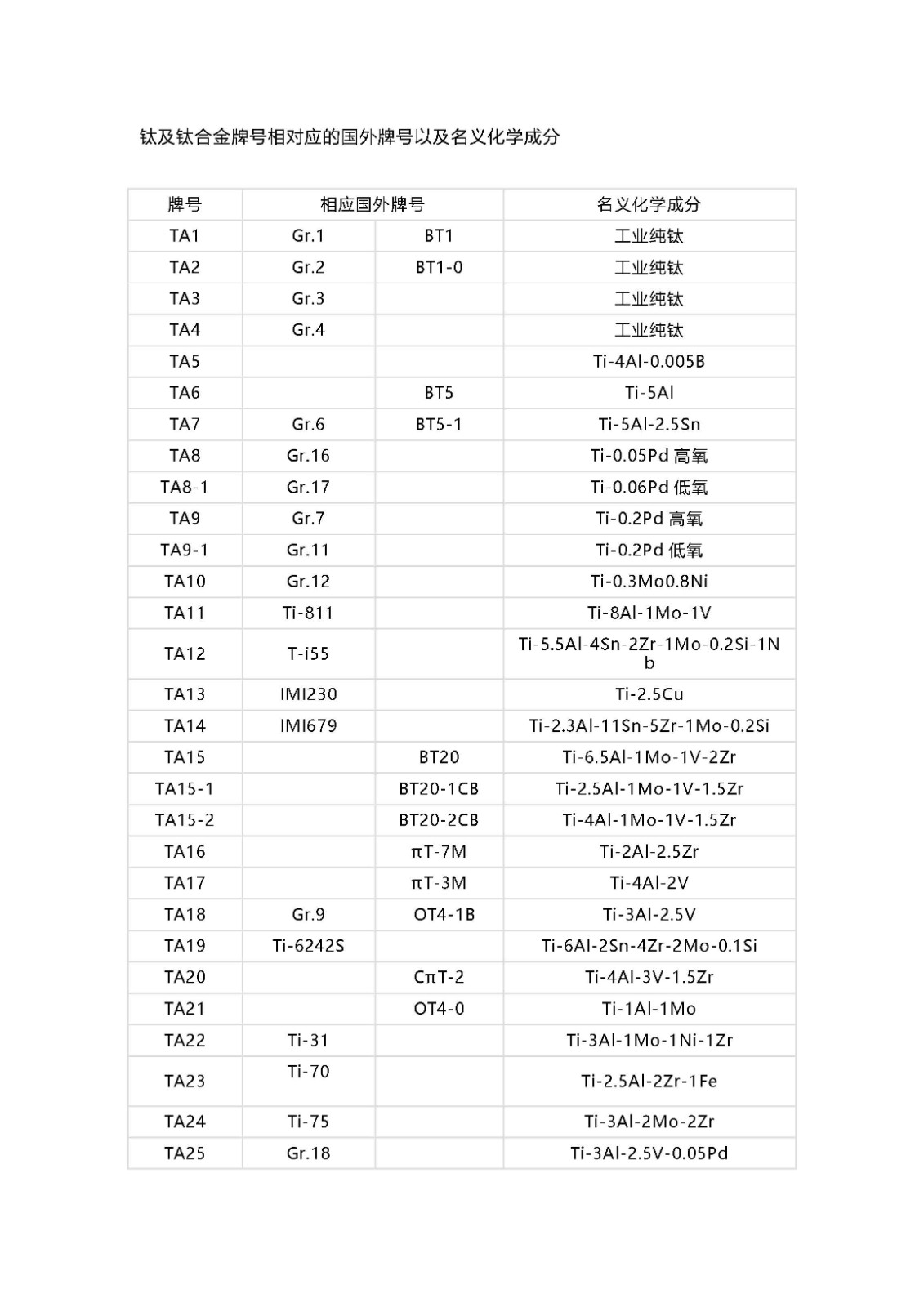 鈦及鈦合金牌號(hào)相對(duì)應(yīng)的國(guó)外牌號(hào)以及名義化學(xué)成分
